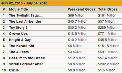 แม้ว่า The Last Airbender จะโดนทั้งนักวิจารณ์และแฟนการ์ตูนสับแหลกไม่เหลือดี แต่หนังบังไนท์ก็ยังเปิดตัวที่อันดับสองด้วยรายรับ 40 ล้านเหรียญในช่วงสุดสัปดาห์ รวมกับรอบพรีวิวเมื่อพฤหัสที่ผ่านมาหนังก็ทำรายได้รวมไปเกือบ 60 ล้านเหรียญ (หนังใช้ทุนสร้าง 150 ล้านเหรียญ) นี่ถ้ายอมไปเปิดตัวหลัง Eclipse เสียหน่อย คงดีกว่านี้ (หรือเปล่า)