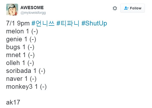 วันนี้คนฟัง Unnies เกือบ9แสนคนแล้ว (21ชม.) เพลงคนฟังมากที่สุดภายใน24ชม.ของเมล่อนปีนี้คือ AKMU - Re-bye (1Mคน) / Flearthip _________________