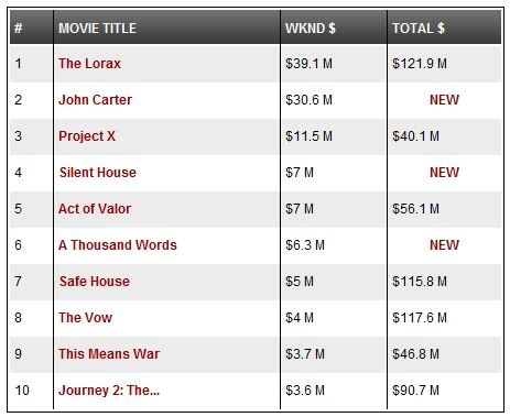 ตัวการ์ตูนสีส้มยังคงครองแชมป์บ็อกซืออฟฟิศจากสัปดาห์ที่แล้ว เพราะวีคนี้ Lorax ตัวการ์ตูนจากซีรี่ส์ Dr.Seuss ทำรายได้ไปถึง 39.1 ล้านเหรียญ ทำเอาพระเอกจอห์น คาร์เตอร์ที่เดินทางไกลจากโลกไปรบที่ดาวอังคารจ่ออยู่ที่อันดับสองด้วยรายรับ 30.6 ล้านเหรียญ ทั้งๆ ที่ลงโรงฉายเท่าๆ กัน อย่างไรก็ดีถึง Lorax เองนั้นรายรับตกลงจากสัปดาห์ที่แล้วถึง 45เปอร์เซ็นต์ แต่ก็ทำรายได้ในสิบวันไปแล้วถึง 121 ล้านเหรียญแล้ว